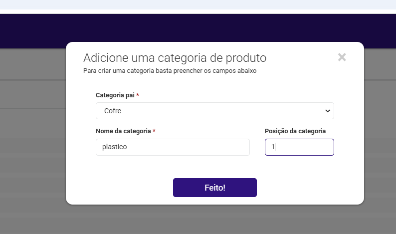 Passo 2 - Na opção “Categoria Pai” Selecione a categoria que você criou e em “Nome da Categoria” digite a Subcategoria e para concluir basta clicar em “feito!”.