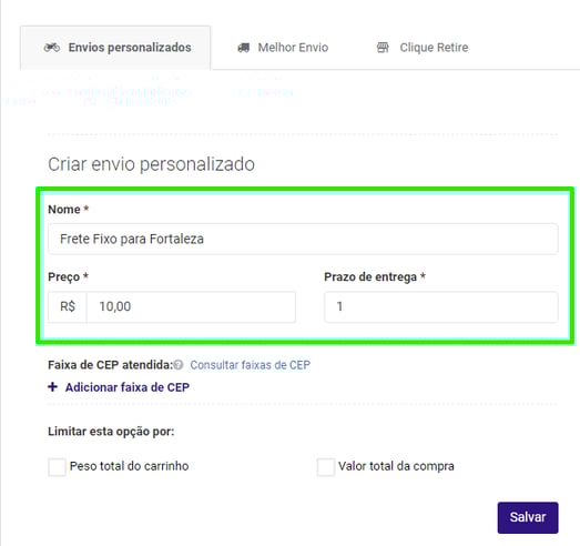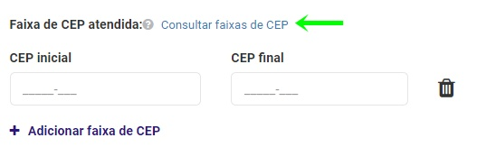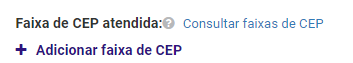 Passo 3 - O próximo passo é adicionar a faixa de CEP da região que terá o valor fixo na entrega.
