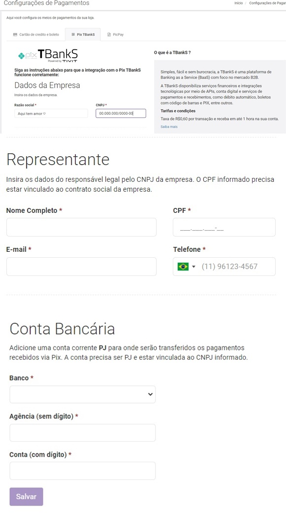 Para vincular o PIX a sua loja virtual, o sistema pede algumas informações: