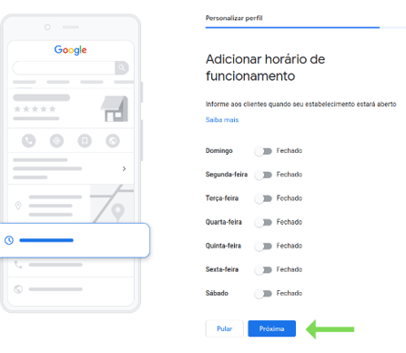 Passo 10 - Adicione um horário de funcionamento e clique em “PRÓXIMA”