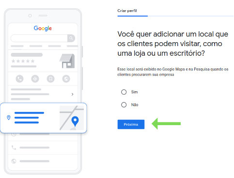 Passo 5 - Defina se você faz entregas ou visita seus clientes e clique em “PŔOXIMA”