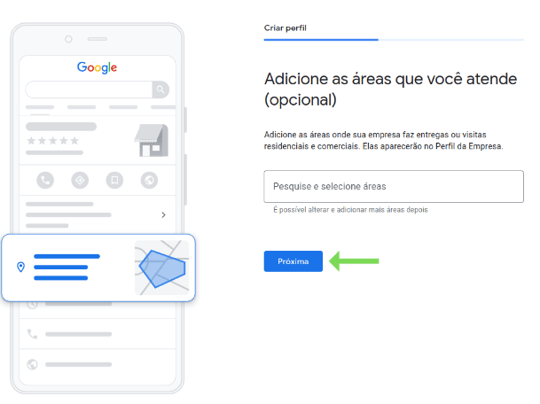 Passo 7 - Adicione as áreas que você atende e clique em “PRÓXIMA”