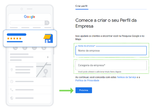 Passo 2 - Adicione o nome da sua empresa e a categoria e clique em “PRÓXIMO”;