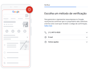Escolha uma forma de validação do Google, isso é solicitado por uma questão de segurança. Você receberá uma carta do Google no endereço da sua loja, nela haverá um código que você irá inserir no Google Meu Negócio para validá-lo