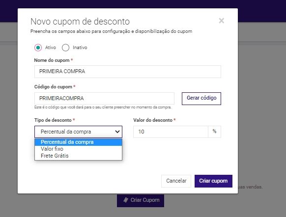 Passo 2 - Após clicar em Criar Cupom, basta preencher as informações como nome do cupom, código do cupom, escolher o tipo de desconto e a porcentagem do desconto.