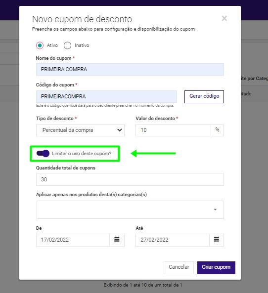 💡 Caso queira limitar a quantidade de usos do cupom criado, ative a opção “Limitar o uso deste Cupom?” e em seguida preencha as informações: