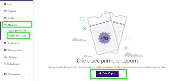 Passo 1 - Clique em Marketing > Cupons de Atendimento > Criar Cupom