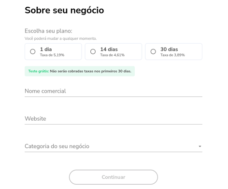 - Escolha seu plano e as taxas: 1 dia, 14 dias ou 30 dias, podendo ser alterado;