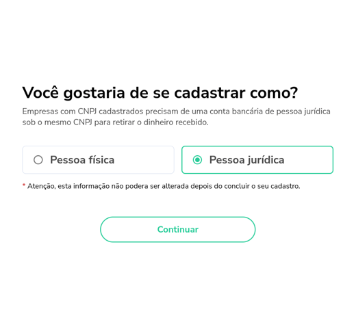 🛑 Caso o cadastro seja feito como pessoa jurídica, será preciso de uma conta bancária de pessoa jurídica com o mesmo CNPJ para realizar transferência.