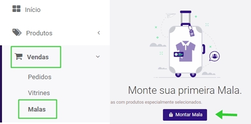 Passo 1 - No Menu Principal do lado esquerdo clique em Vendas > Malas > Montar mala