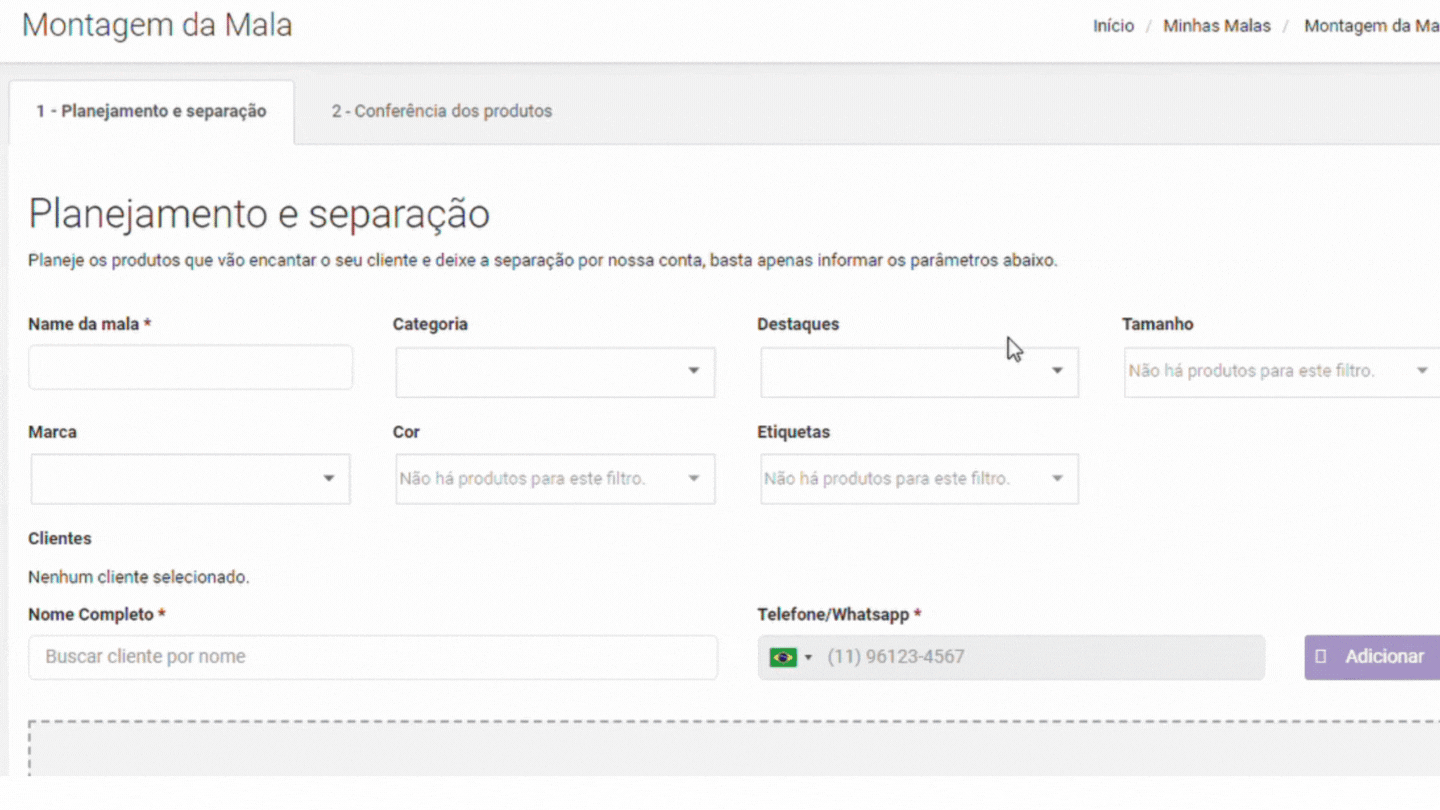 Passo 2 - Adicione o nome da sua Mala e selecione os filtros que deseja encontrar os melhores produtos para seu cliente.