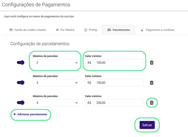 Caso você deseje apagar um parcelamento é só clicar no ícone de lixeira no lado direito. Depois de adicionar todas as formas de parcelamento é só clicar em salvar.