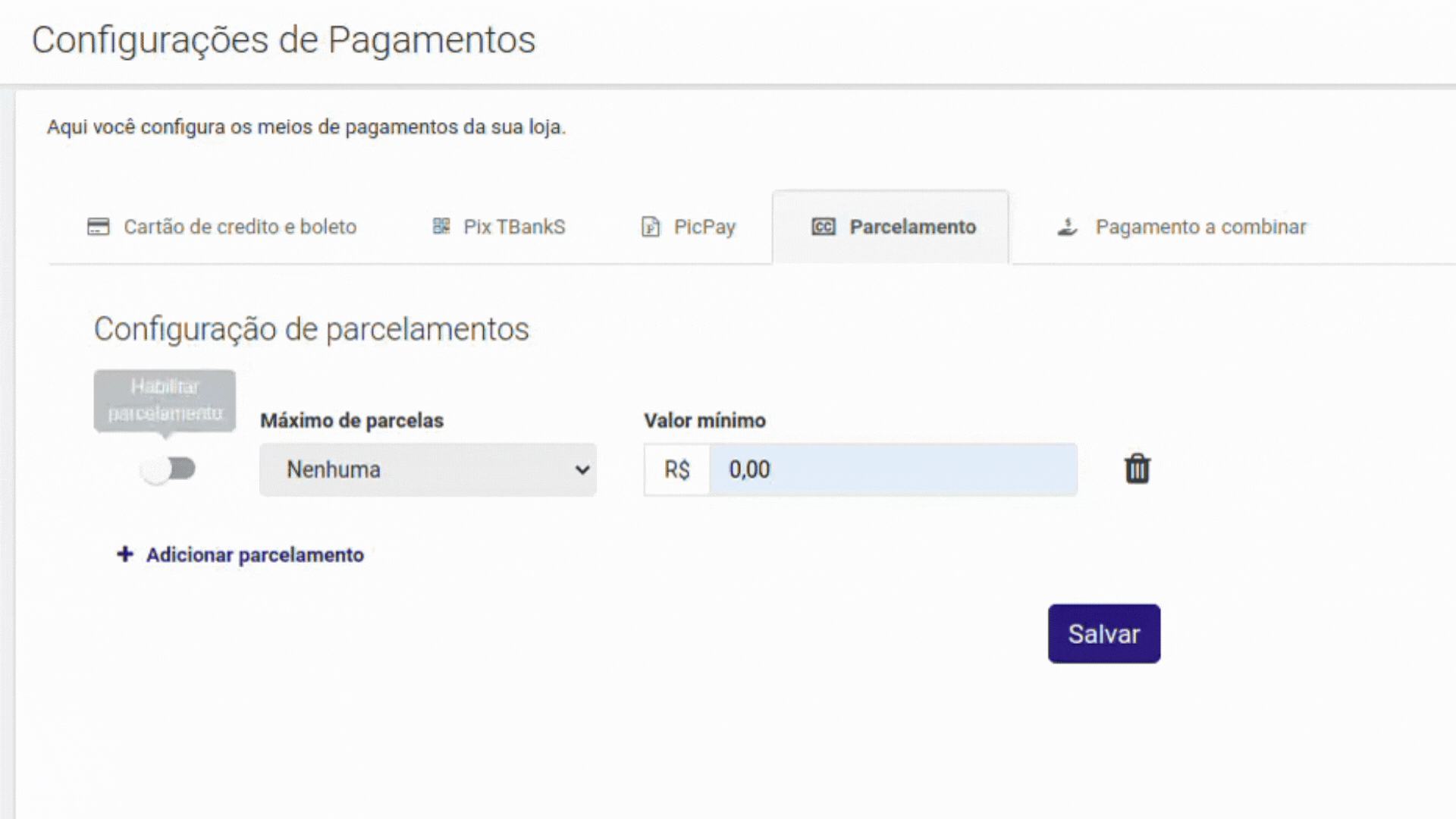 Passo 4 - Defina a quantidade "Máxima de Parcelas" e o "Valor Mínimo" para cada tipo de parcelamento, você pode adicionar quantos parcelamentos você desejar nessa etapa, é só clica em "Adicionar Parcelamento":