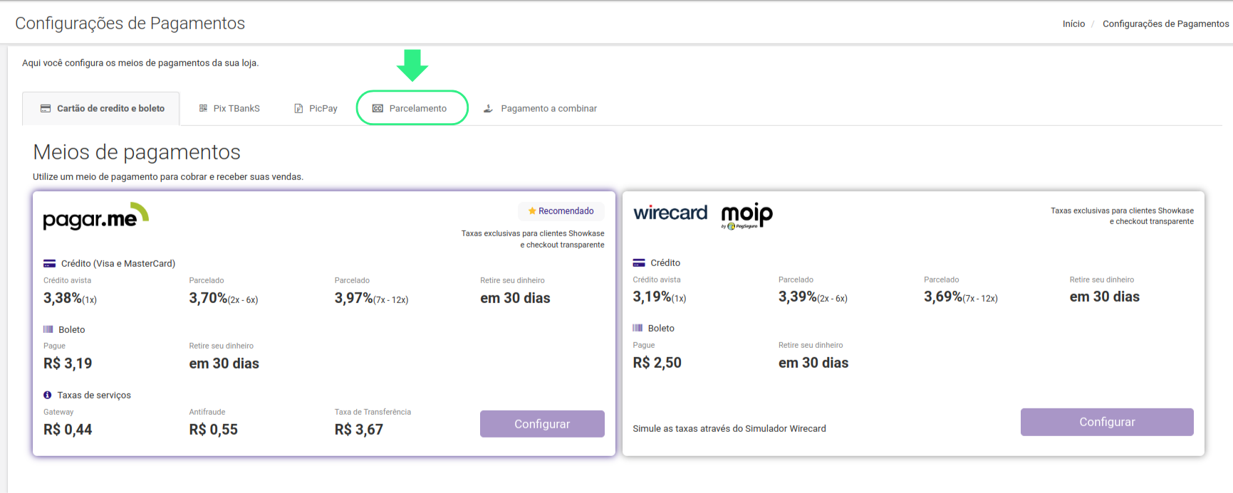 Passo 3 - Na tela de "Configurações de Pagamento" clique na opção de “Parcelamento”, conforme a imagem abaixo: