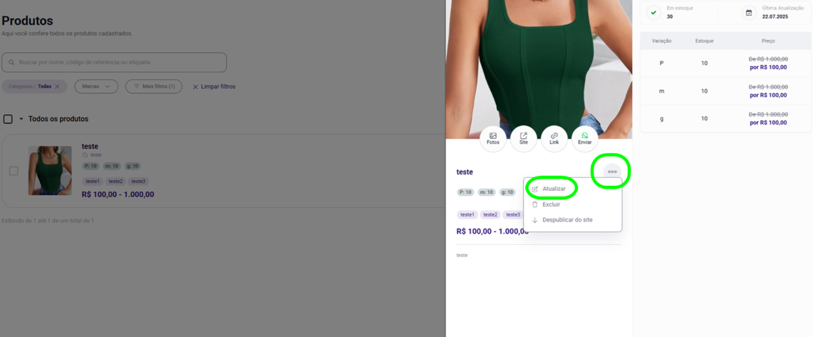 Passo 2 - Selecione o produto que deseja editar → clique nos 3 pontinhos → escolha a opção “Atualizar”.