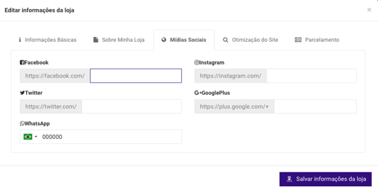 Passo 4 - Irá abrir uma nova janela, nessa nova janela clique na terceira aba "Mídias Sociais", agora é só preencher e editar ás informações que deseja