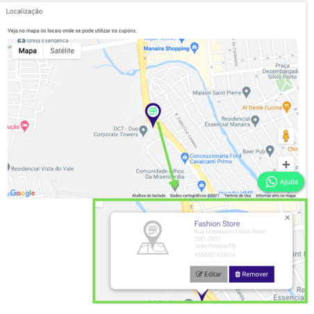Passo 2 - Na tela que abriu, é possível visualizar o mapa em “Localização”, clique sobre o pino, em cima do mapa, para editar ou remover o endereço informado .