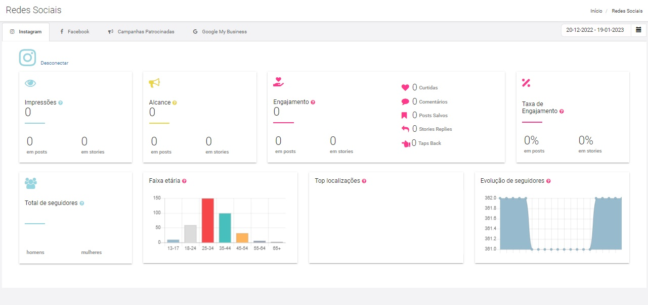 Depois das redes sociais estiverem conectadas, você pode acompanhar todas ás métricas e engajamentos alcançado no seu Instagram e Facebook. 😀