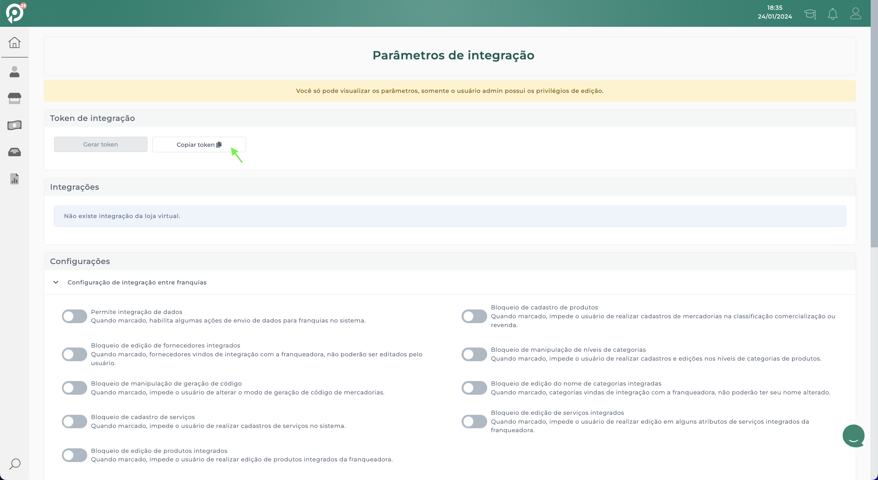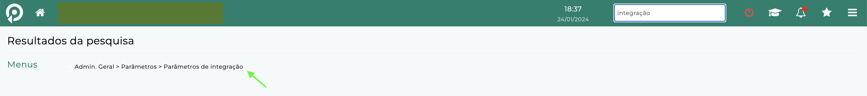 Clique no resultado da pesquisa: Admin.Geral > Parâmetros > Parâmetros de integração.