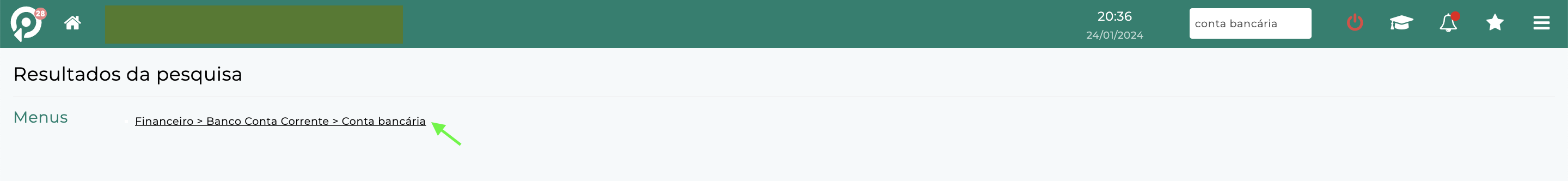Clique no resultado da pesquisa: Financeiro > Banco Conta Corrente > Conta bancária.