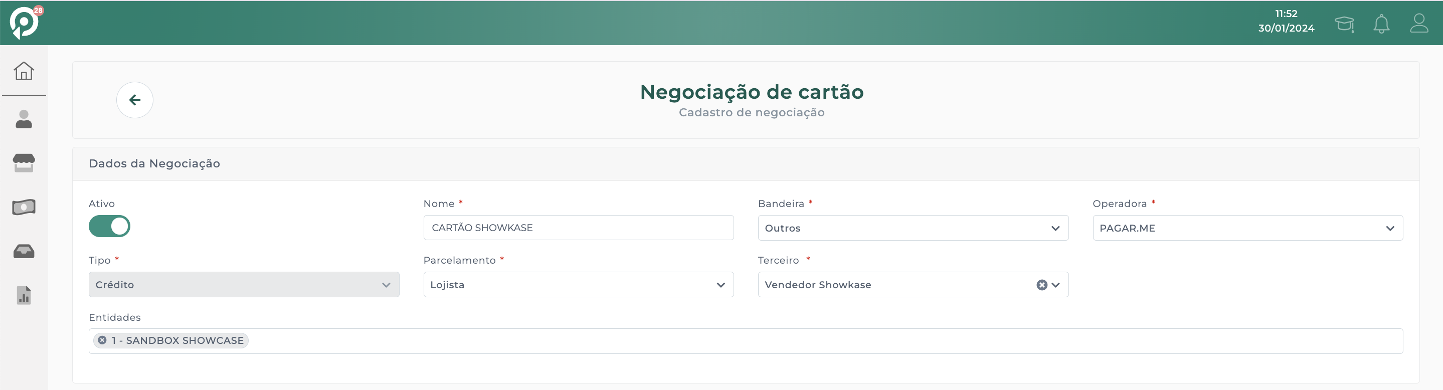 Clique no resultado da pesquisa: Financeiro > Controle Manual de Cartões > Negociação de Cartão.