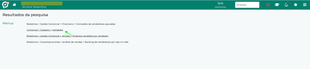 Clique no resultado da pesquisa: Comercial > Cadastro > Vendedor.