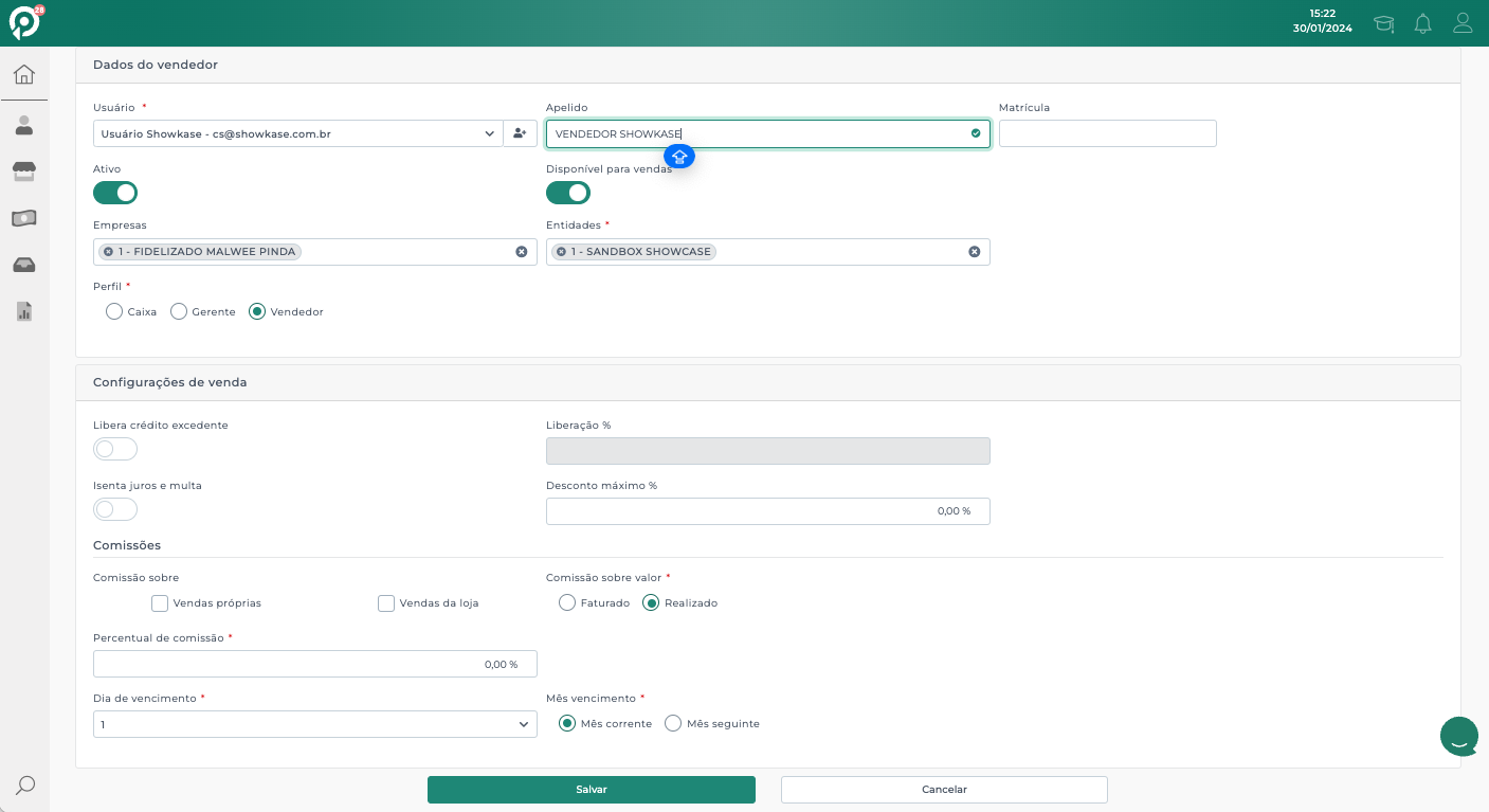 Após selecionar os vendedores, clique em "Associar usuários" e repita esse passo para todos os seus vendedores. Após isso, clique em Salvar.