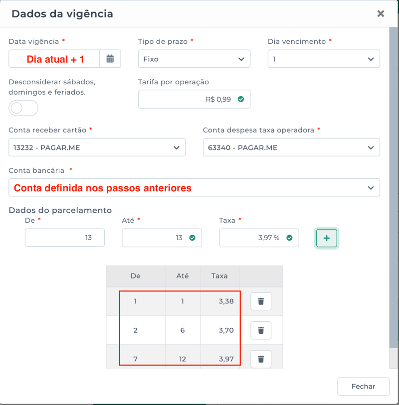 Em Dados do parcelamento, insira as taxas: