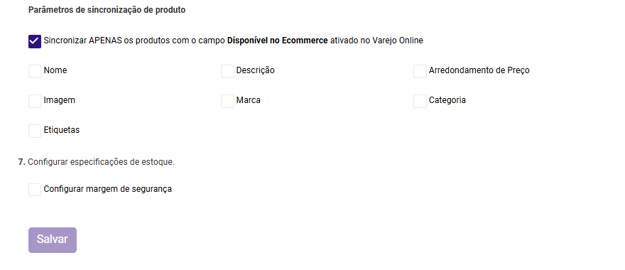 PASSO 25: Configure as especificações da integração. É nesta etapa que você define qual será o campo da Varejonline que representará a categoria e marca dos seus produtos.