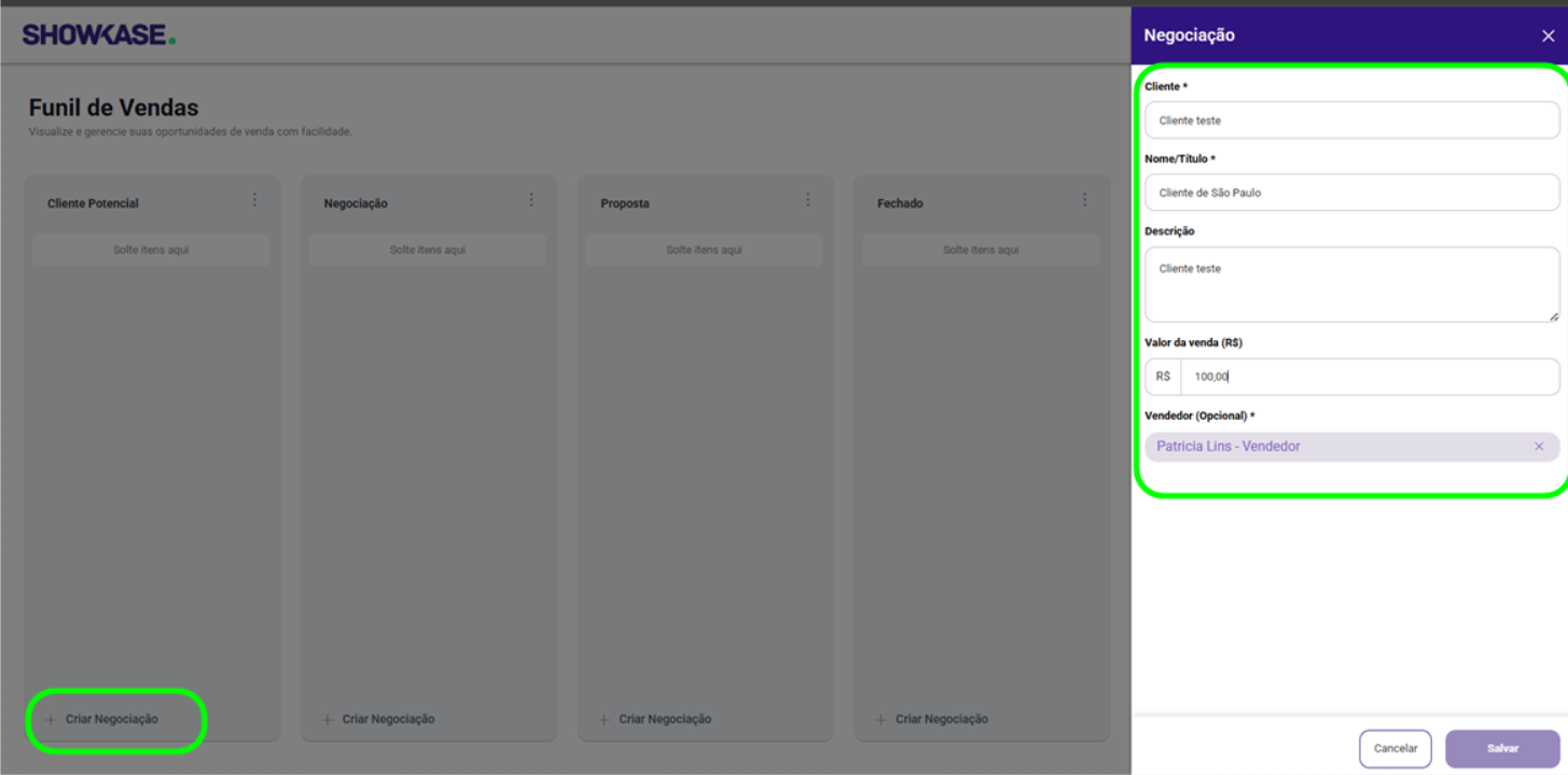Clique em “Criar Negociação” abaixo de qualquer etapa do funil.